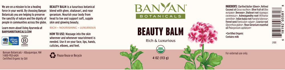 Beauty Balm features nourishing ghee, shatavari, and the subtle scent of rose geranium. This richly lubricating blend helps to soften the skin, rejuvenate the tissues, and cultivate glowing beauty.