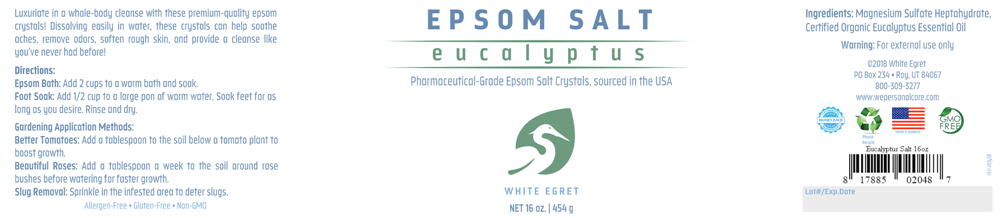 Ingredients: Magnesium Sulfate Heptahydrate, Certified Organic Eucalyptus Essential Oil.
