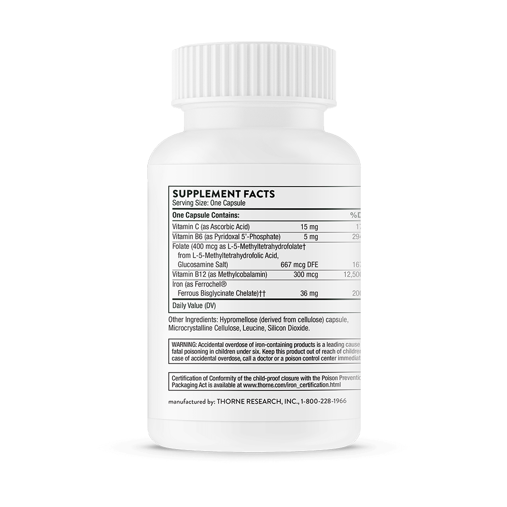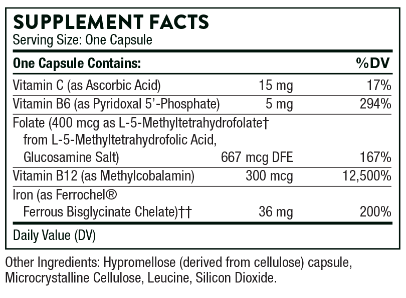 Ferrasorb provides 36 mg of elemental iron per capsule, plus the active forms of folate and vitamins B6 and B12, which are essential for blood-building.* Vitamin C optimizes iron absorption.*