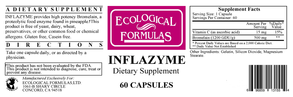 A dietary supplement designed to help the digestive system more fully and completely digest protein. The key ingredient in Inflazyme by Ecological Formulas is bromelain, a combination of essential enzymes sourced from the steam and juice of the pineapple fruit. The bromelain in this supplement is combined with vitamin C to provide a very powerful blend of ingredients..
