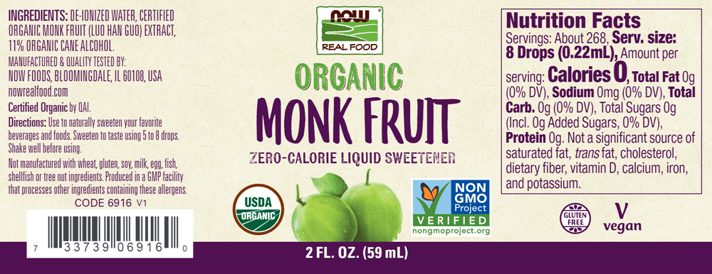 Monk fruit, also known as Luo Han Guo, is our newest zero-calorie sweetener. Monk fruit is significantly sweeter than sugar, up to 200 times as sweet and is a fantastic alternative to sugar in beverages. NOW Real Food® Organic Monk Fruit Liquid has a delightfully vibrant, sweet taste with very little aftertaste.