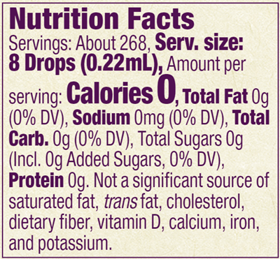 Suggested Usage: Use to naturally sweeten your favorite beverages and foods. Sweeten to taste using 5 to 8 drops.