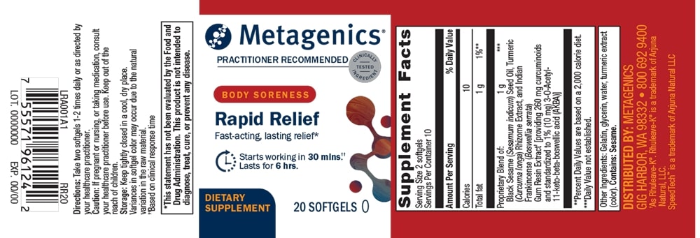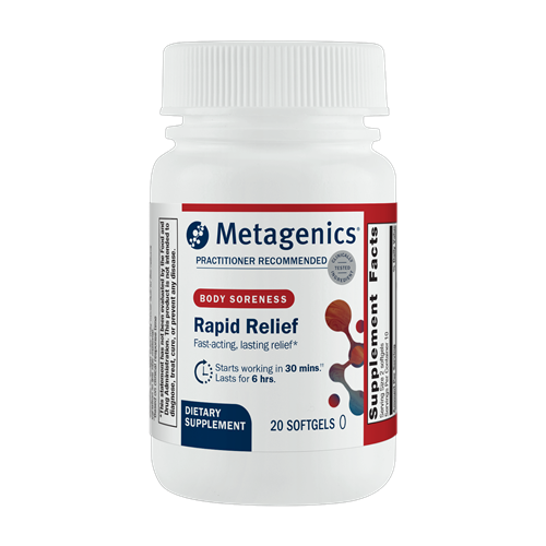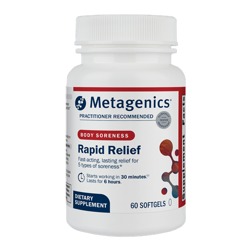Feel relief from minor pain and discomfort with Rapid Relief—a naturally derived, fast-acting, drug-free pain reliever that delivers long-lasting results. This formula features a powerful blend of turmeric, boswellia, and black sesame seed oil to help soothe five types of soreness. It is formulated with patented technology to deliver rapid relief.*