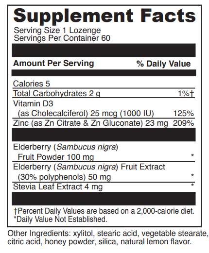 Zinc lozenges are well-studied for supporting respiratory health and keeping throat tissues comfortable and healthy.* Elderberry (Sambucus nigra) has a good track record as a botanical involved in lung and immune system health.* Vitamin D3 keeps immune cells working at peak capacity.* Many elderberry and zinc lozenges on the market contain sugar, but our lemon-berry lozenges taste great and are sweetened with xylitol, stevia, and honey powder.