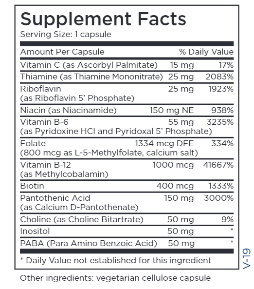 Overview: B-Complex formulas typically provide a combination of 8 B vitamins. Our B-Complex contains the phosphorylated forms of B-2 (Riboflavin) and B-6, and the methylated forms of B-12 and folate (L-methylfolate) for superior bioavailability, as well as some additional, valuable nutrients to support the work of B vitamins within your body systems. B vitamins are involved in cellular energy production, conversion of homocysteine, heart health, nerve health, neurotransmitter formation, and healthy red blood cell formation.