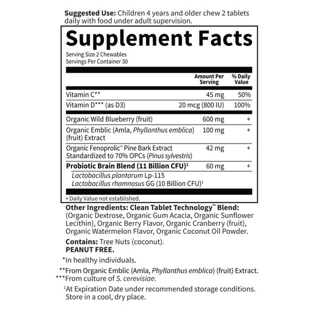 Each sweet and tart chewable tablet contains an amazing 10 Billion CFU of Lactobacillus rhamnosus GG—one of the most studied probiotic strains, plus brain-supporting nutrients from Whole Food Vitamin D3 and antioxidant-packed Organic Amla berry Vitamin C, Organic wild blueberries and Organic Fenoprolic™ Pine Bark Extract.†