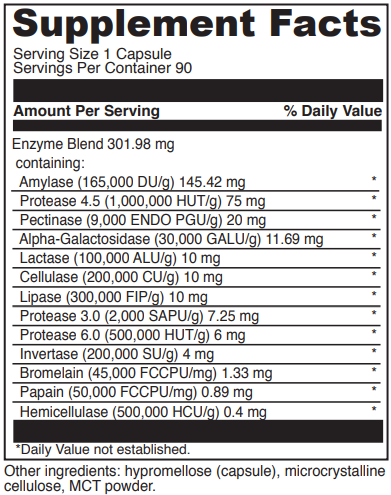 The ability of an enzyme to interact with its substrate is attributed to the conformational structure of the enzyme’s active site. Simply stated, the active site of a protease will “fit” with the shape of proteins where it does not “fit” with a carbohydrate or fat. The need for enzymes are exacerbated with altered digestive function in the upper digestive tract. When stomach acid is altered there is a downstream effect on enzyme secretion from the pancreas. This creates a need for supplemental enzymes to facilitate proper breakdown, absorption and assimilation of nutrients. This comprehensive formula includes the following broad range of enzymes (listed below with their functions) at clinically significant levels.