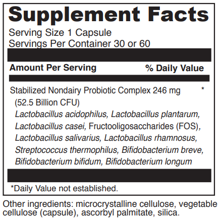 Probiotic 50 contains 9 species of microorganisms from non-dairy sources. Because each strain has an affinity for a different part of the digestive tract, and a unique mechanism of action, a product that delivers multiple strains is preferable to single strain products.*