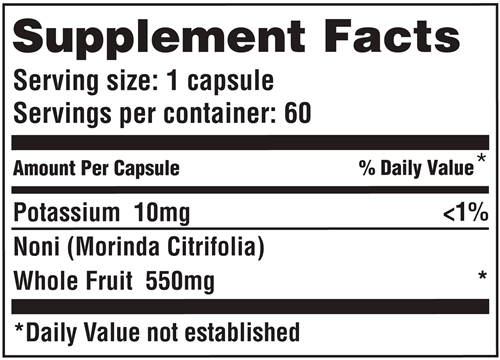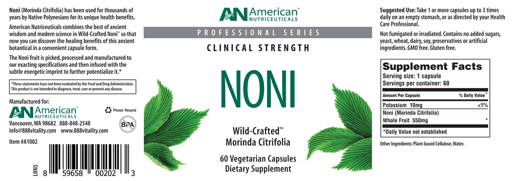 The best source of Noni is grown on rich, pristine volcanic ash fields, which provide a necessary mineral (especially the mineral selenium). Morinda citrifolia (Noni) according to ancient manuscripts handed down from generation to generation, describe many uses for this plant. The Noni fruit is considered an adaptogen, which shows up in cells as a nutrient, supporting cells. Noni also helps to support the oxygen flow to cells in the body. In this way, Noni acts like an antioxidant to help neutralize free radicals. American Nutriceuticals uses 100% pure, "whole fruit" Noni, which is picked ripe in the fields and then into powder that is encapsulated. The advantage of this process is that it prevents deterioration of macro and micro nutrients in the fruit and preserves a native ratio between the bioactive components. Noni has been shown to be effective for immune support, detoxification and many others.*