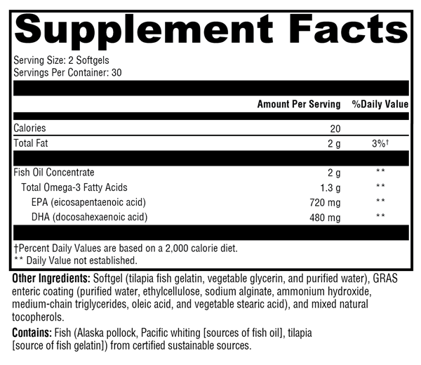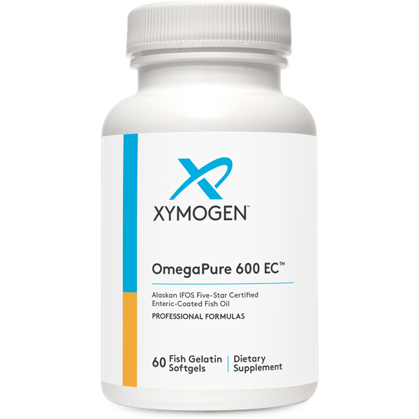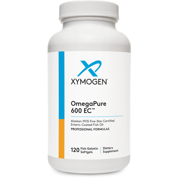 OmegaPure 600 EC™ is International Fish Oil Standards (IFOS) five-star certified, which assures the highest level of purity, stability, and potency in fish oils. Each fish-gelatin–based softgel provides 600 mg of EPA and DHA. The softgels are covered with a GRAS-certified enteric coating so that they are easy to swallow and the EPA/DHA content is optimally absorbed. EPA and DHA from fish oil promote wellness by supporting cardiovascular health, cytokine balance, joint health, and brain and nervous system function.*