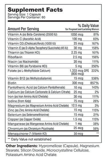 Total One Prenatal, which includes Calcium, Folate, Chromium and more, provides optimum nutrition during pregnancy in a convenient once-daily capsule. It can be taken while nursing as well as during pregnancy, providing nutritional fortification that benefits both mother and baby. During the early months of pregnancy, the developing fetus uses essential nutrients to form cells and organs. The absence of these nutrients can result in permanent birth defects.