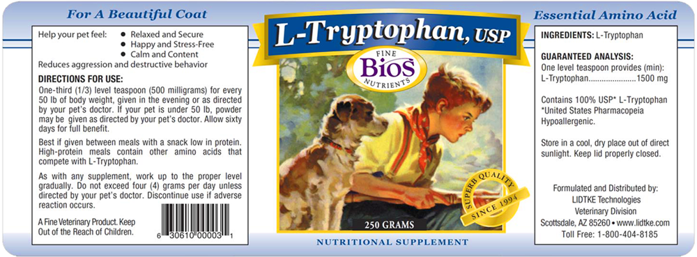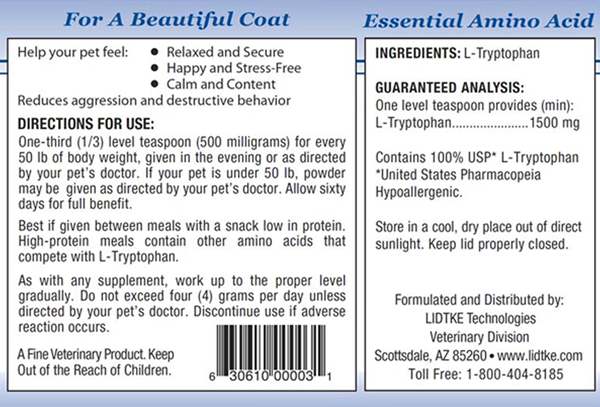 One-third (1/3) level teaspoon (500 milligrams) for every 50 lb of body weight, given in the evening or as directed by your pet's doctor. If your pet is under 50 lb, powder may be given as directed by your pet's doctor. Allow sixty days for full benefit. Best if given between meals with a snack low in protein. High-protein meals contain other amino acids that compete with L-Tryptophan. As with any supplement, work up to the proper level gradually. Do not exceed four (4) grams per day unless directed by your pet's doctor. Discontue use if adverse reaction occurs.
