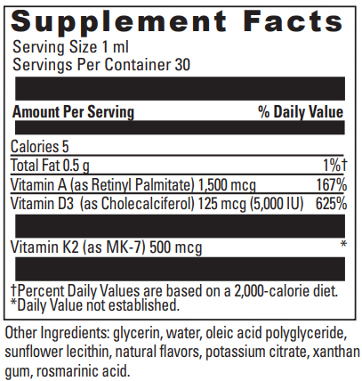 Liposomal ADK contains the vitamin heavy-hitters that work in combination to build healthier, stronger, more resilient bones throughout life.* Vitamin A supports growth and repair of bones.* Vitamin D regulates absorption of calcium in the gut.* Vitamin K2 activates a critical protein, osteocalcin, which incorporates calcium into bones.* With these vitamins on your side, you’ll have strong, dense, durable bones that will last a lifetime.*