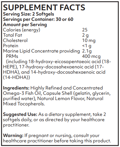This unique, SPM omega-3 derived supplement was designed to help modulate and resolve inflammation. SPM stands for “Specialized Pro-resolving Mediators” which are recently discovered, naturally occurring substances derived from omega-3 and omega-6 fatty acids. Our bodies make SPMs as a response to help resolve inflammation and they can be produced all over the body in areas like the bloodstream, nervous system tissue, and breastmilk.
