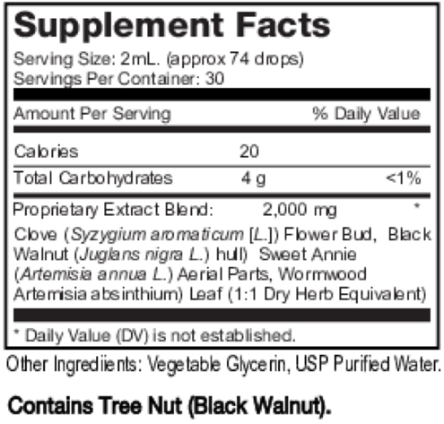 This unique handcrafted herbal tincture contains 3 key herbs, Wormwood, Cloves, and green Black Walnut Hulls.