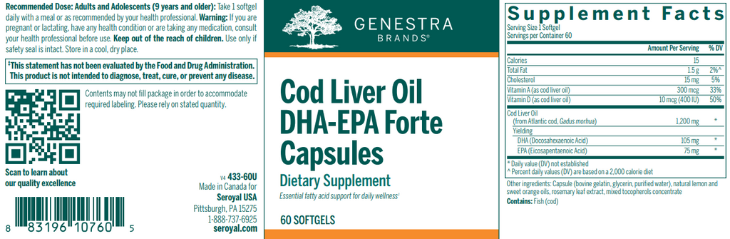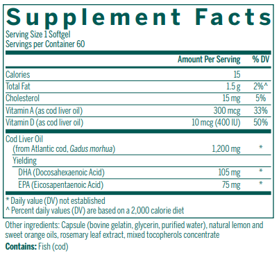 Cod Liver Oil DHA/EPA Forte Capsules contain an effective blend of DHA, EPA, and vitamins A and D that promotes optimal health.