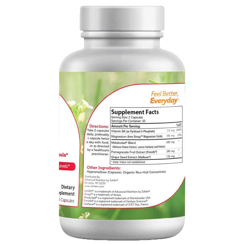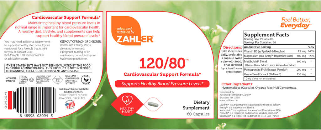 Zahler's 120/80 is an innovative formula which includes well-researched and clinically studied ingredients known to support healthy blood pressure levels, which are critical for cardiovascular health. High blood pressure can potentially lead to serious cardiovascular disease if left unchecked. An improvement in diet, lifestyle, and natural supplements can go a long way to managing high blood pressure. The powerful combination in the 120/80 formula together with a healthy diet and improved life habits promote healthy blood pressure levels and a healthy cardiovascular system.