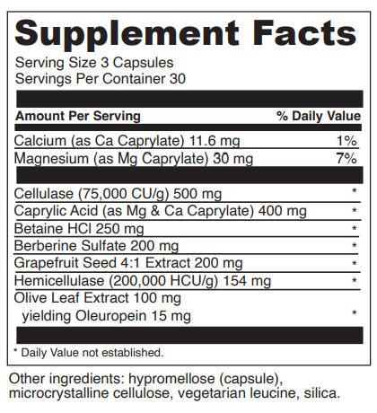 Candid-Away™ is specifically formulated to support detoxification of the digestive tract to maintain a healthy balance of intestinal microflora.* It combines a unique mixture of Olive Leaf Extract to support immune system function, Calcium Caprylate and Grapefruit Seed Extract to maintain a healthy balance of intestinal microflora, Berberine to inhibit the growth of yeast, bacteria and protozoa, Betaine HCl for acid balance in the stomach and fiber digesting enzymes (cellulase and hemicellulase) to balance microflora.*