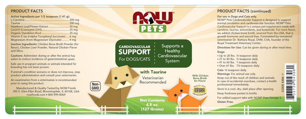 NOW® Pets Cardiovascular Support is designed to support normal circulation and cardiovascular function. NOW® Pets Cardiovascular Support is a unique pet supplement made with carnitine, taurine, antioxidants, and botanicals. For more flavor, we added chicken bone broth, sourced from the USA, that is growth hormone and steroid free. Formulated by renowned veterinarian Dr. Barbara Royal, DVM, CVA, founder of the Royal Treatment Veterinary Center.