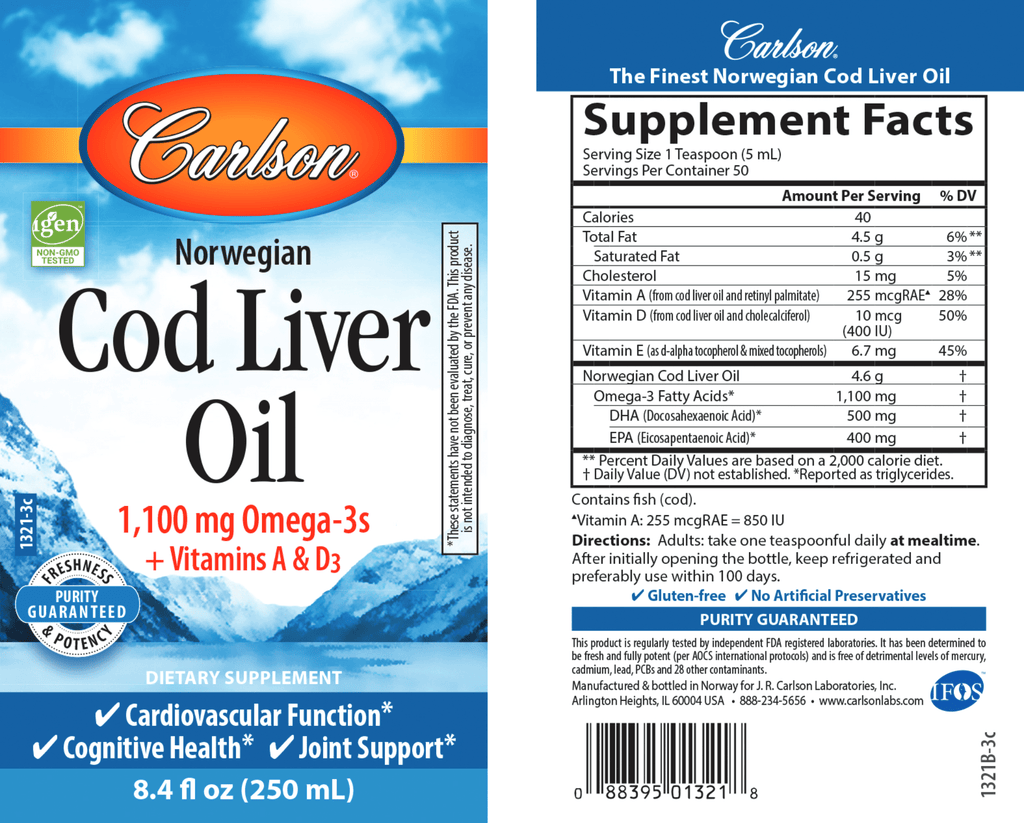Carlson Cod Liver Oil has received numerous awards for its taste and quality. A single teaspoonful provides 1,100 mg of omega-3s, including EPA and DHA, which support heart, brain, vision, and joint health. To ensure maximum freshness, Cod Liver Oil is closely managed from sea to store.