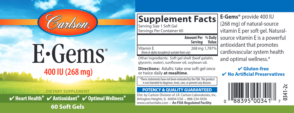 Since 1965, Carlson has provided one of the most complete lines of high-quality, natural-source vitamin E. Vitamin E plays an important role in cardiovascular health and is recognized as one of the best antioxidants. E-Gems® provides 400 IU (268 mg) of vitamin E per soft gel.