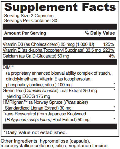 Estro Benefits™ is a blend of DIM® combined with Vitamin D3, Vitamin E, Calcium D-Glucarate, Indole-3-Carbinol, Green Tea Extract, HMRlignan™, and Trans-Resveratrol. Estro Benefits is a state of the art formula that supports hormone balance and cellular health in both men and women.*