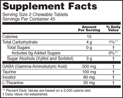 GABA (gamma-aminobutyric acid) is a non-protein amino acid that functions as a neurotransmitter in the human brain.* GABA is naturally produced in the body and its presence within the central nervous system may help promote relaxation and ease nervous tension.* Delicious orange flavor NOW® Chewable GABA combines this naturally occurring neurotransmitter with the relaxing amino acids taurine and theanine for their complementary functions.*