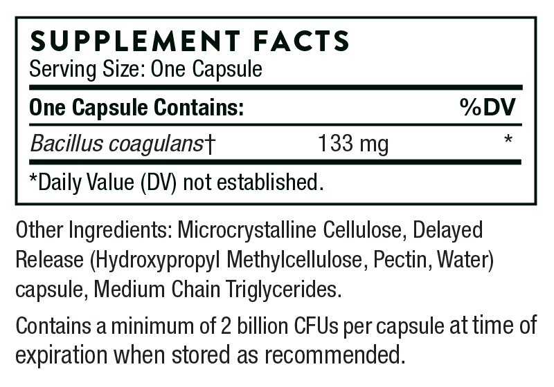 Bacillus Coagulans is a stable probiotic bacteria that survives stomach acid and retains its potency in the intestines, where it acts to promote a healthy gut flora.* Numerous clinical studies have found that the exact strain of bacteria in Thorne’s Bacillus Coagulans improves bowel function.*