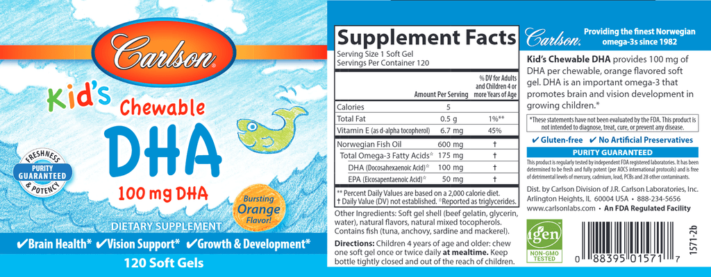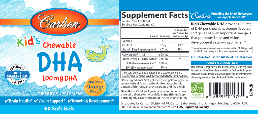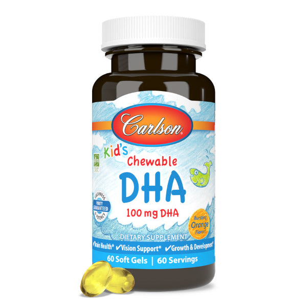 The omega-3 fatty acid DHA promotes healthy brain development and vision in growing children. Kid's Chewable DHA is a fun and tasty way to receive these benefits. Each soft gel bursts with delicious orange flavor from natural fruit sources. And like all Carlson omega-3s, freshness, potency, and purity is guaranteed.