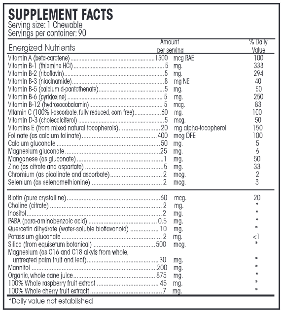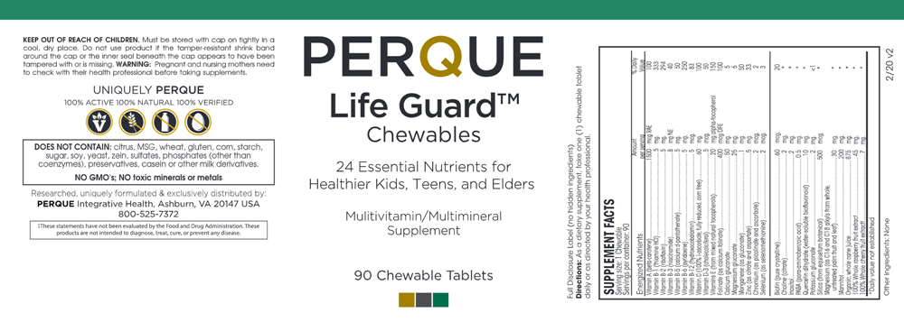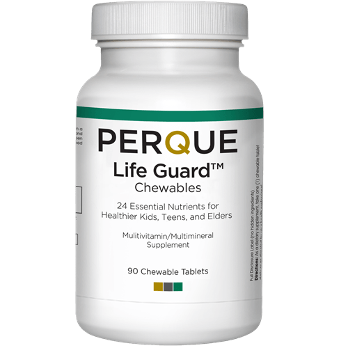 PERQUE Life Guard™ Chewables are a great-tasting, comprehensive 24-nutrient formula for both children and adults. Only the PERQUE complete formula includes the following important nutrients for children that many others leave out: chromium to aid in sugar metabolism;* silica to promote bone, hair, skin, and connective tissue health;* manganese to support sugar metabolism and bone and connective tissue health;* and biotin to promote proper fat, protein, and sugar metabolism.* What you don’t find in supplements is often just as important as what you do find. PERQUE Life Guard Chewables are free of iodine, iron, and copper. These nutrients should always be taken separately. When included in a daily foundational multi-vitamin formula, they can oxidize the antioxidants and cause free radical damage. Additionally, iron should always be taken separately as it competes with calcium and zinc.*