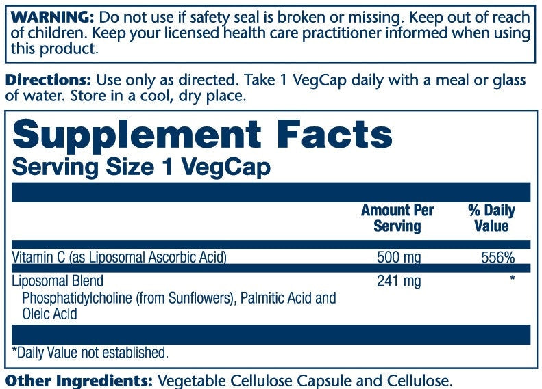 Solaray™ Liposomal Vitamin C vegetable capsules contain 400mg of fat soluble vitamin C. Liposomal C is created by combining vitamin C with fatty acids designed to provide antioxidant support to cell membranes and aid in the absorption of vitamin C.* Vitamin C provides antioxidant activity and is intended to help support normal, healthy collagen synthesis, capillary and blood vessel integrity, cartilage and bone development, immune function and nerve impulse transmission.*