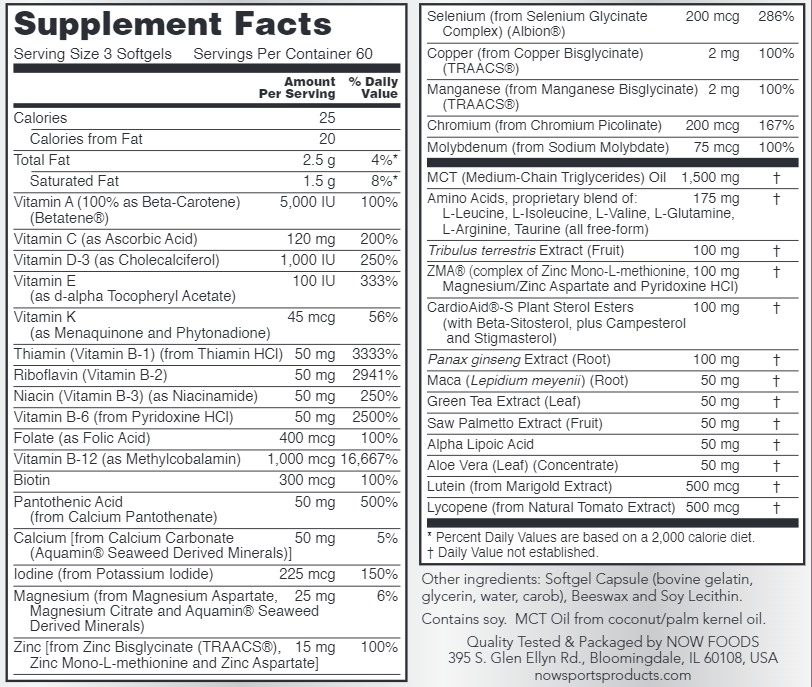 This daily multi-vitamin for active men features free-form amino acids, ZMA®, tribulus, MCT oil, herbal extracts, and more. Specially formulated with high-quality ingredients that aren’t usually found in an everyday multivitamin, NOW® Sports Men’s Active Sports Multi supports all levels of athletes. Competitive athletes who are regularly tested should check with their sanctioning body for the status of this supplement.