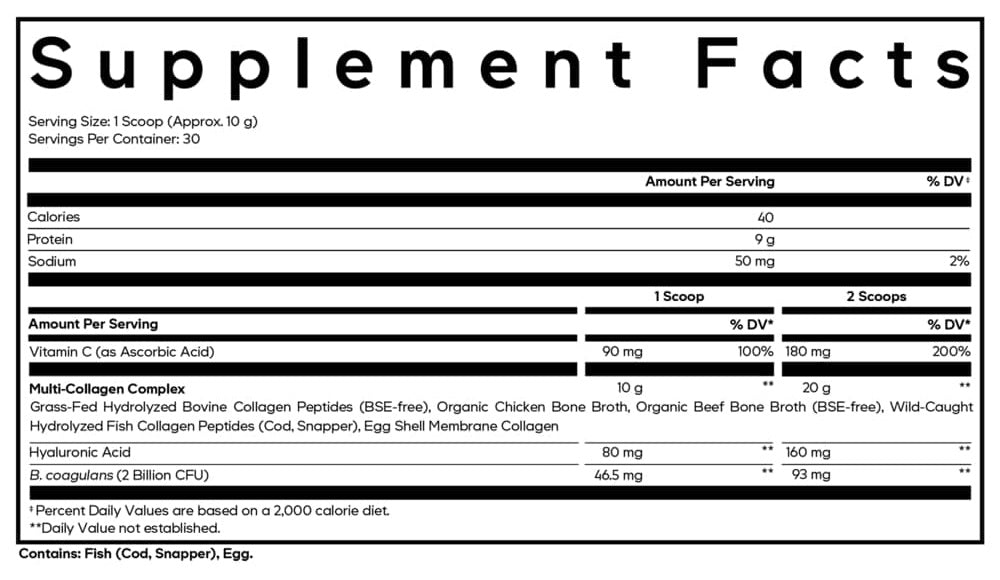 This hydrolyzed collagen supplement is easy to mix with coffees, juices, and other beverages or recipes. Codeage Multi Collagen + Probiotics, Hyaluronic Acid and Vitamin C powder is non-GMO, gluten, soy, and dairy-free. This collagen formula for women and men has also zero carbs and offers amino acids. This unflavored collagen powder formula features 5 food sources of collagen peptides from hydrolyzed bovine collagen peptides, organic chicken bone broth, organic beef bone broth, hydrolyzed fish collagen peptides, and eggshell membrane collagen. Part or all the ingredients provided in this collagen powder formula with probiotics, hyaluronic acid and vitamin C can be received in adequate or extra amounts from food and regular diet alone. Individual results may vary and depend on a lot of factors including age, health conditions, diet, genetic markup, lifestyle, physical activity, and regular exercise.