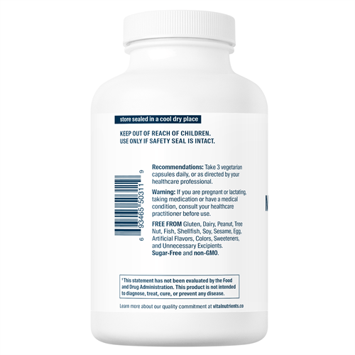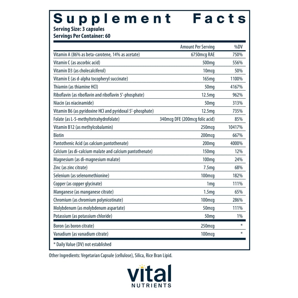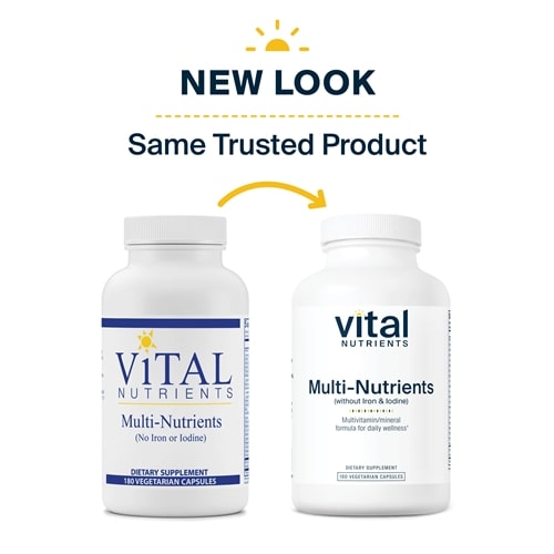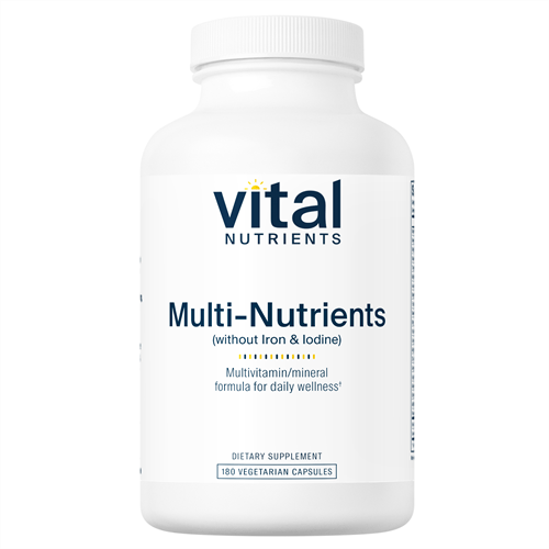 Multi-Nutrients (no iron or iodine) is a high potency multivitamin/mineral and trace element formula designed to provide the highest nutritional value for all body systems, including bone, skin, cardiovascular, liver, and immune support.* This formula incorporates premium ingredients to ensure optimal absorption and physiological activity, including folate as Metafolin® L-5-MTHF, Vitamin D3, potent antioxidants, and mineral amino acid chelates.* Multi-Nutrients (no iron or iodine) is a bioavailable formula well tolerated by most individuals.* It comes in easy-to-digest vegetarian capsules.