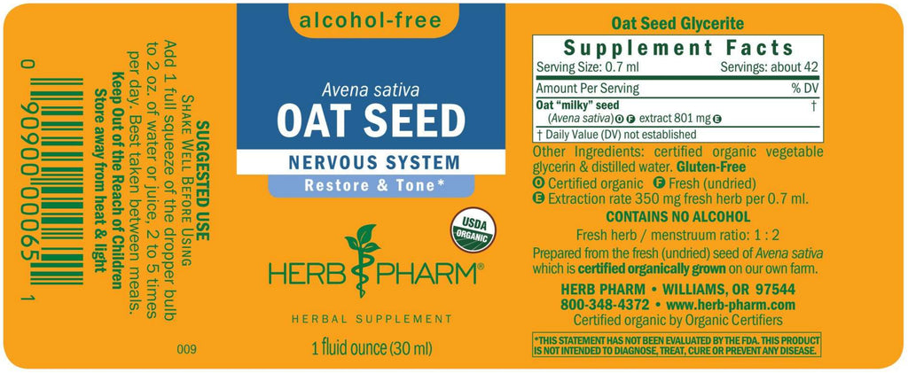 Herb Pharm prepares alcohol-free Oat Seed glycerite from the fresh (undried) seed of Certified Organic Avena sativa plants during their "milky" stage of growth.