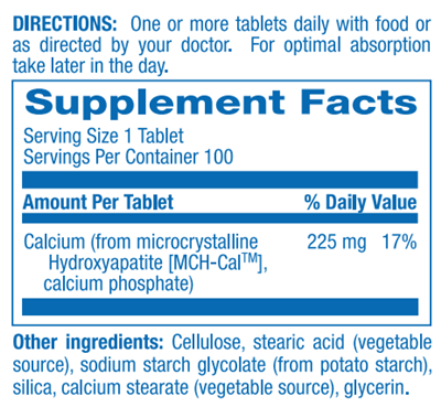 Calcium complex derived from cold processed whole bone microcrystalline hydroxyapatite (MCH). Provides the natural elements found in healthy bone including microcrystalline hydroxyapatite, collagen, bone amino acids, glycosaminoglycans, and a broad range of bone trace minerals in their natural ratios offering excellent support in maintaining bone health.