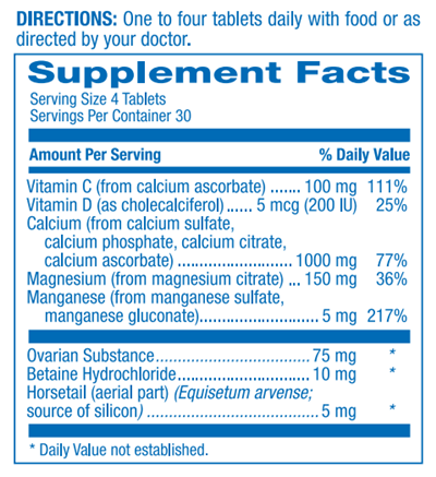 A mineral-vitamin-glandular supplement to provide a diverse approach to bone health. Anacal calcium is a special blend of calcium ascorbate, citrate, phosphate and sulfate, which is provided as well as magnesium and manganese. Betaine hydrochloride is included to support calcium absorption and whole ovarian concentrate for female hormone support.
