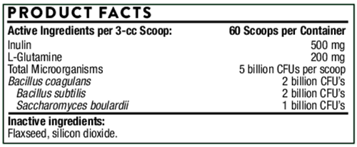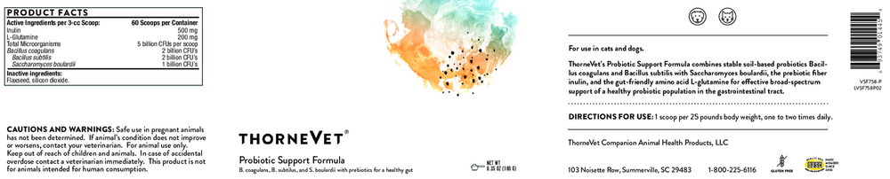 ThorneVet’s new Probiotic Support Formula combines two stable, soil-based probiotics — Bacillus coagulans and Bacillus subtilis — with Saccharomyces boulardii, the prebiotic fiber inulin, and the gut-friendly amino acid L-glutamine for effective broad-spectrum support of a healthy probiotic population in the gastrointestinal tract.
