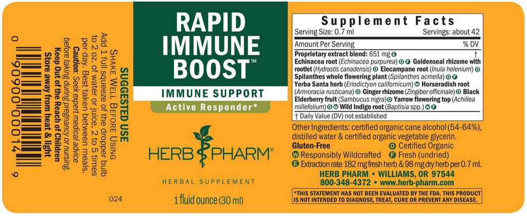 Rapid Immune Boost includes Echinacea extracted from the Certified Organic root of Echinacea purpurea plants grown on farms in southern Oregon. It also includes Goldenseal made from Certified Organic Hydrastis canadensis rhizome and rootlet. Herb Pharm only use cultivated Goldenseal in order to preserve wild-growing populations of this threatened plant.