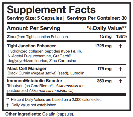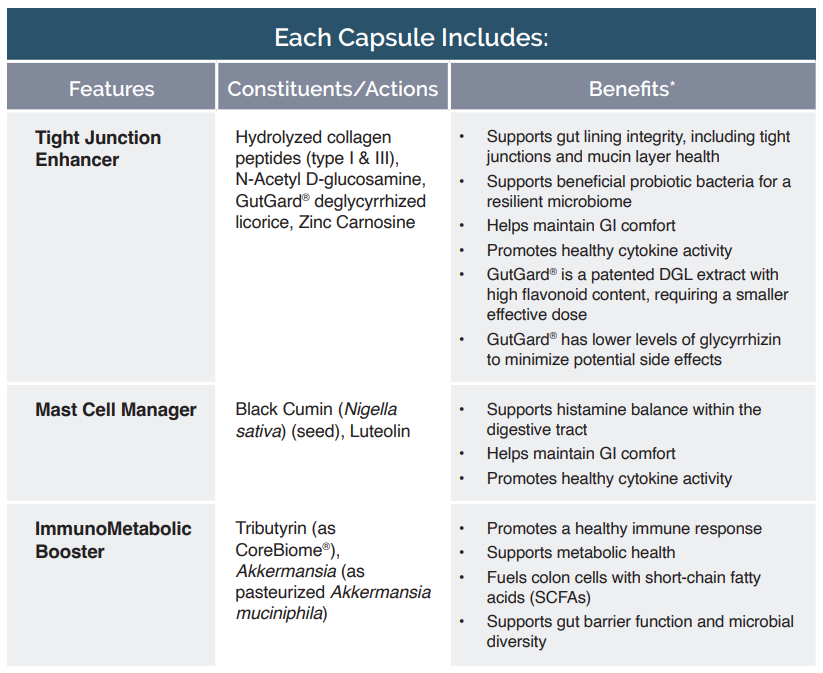 A well-functioning gut barrier is essential for overall health. A healthy gut barrier allows for critical nutrient absorption while blocking absorption of unwanted substances. Free from aloe vera and glutamine (which can cause undesired side effects), this formula instead provides collagen peptides (Types I & III) rich in glycine, proline, and hydroxyproline, along with other key nutrients to support gut lining integrity. Building off of the RenewGut™ formula, RenewGut Thrive™ is additionally enriched with postbiotics, including Tributyrin and pasteurized Akkermansia, for comprehensive support of immune function, metabolic health, and a resilient gut barrier.