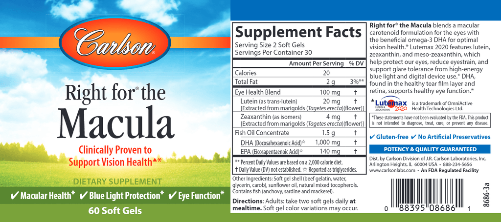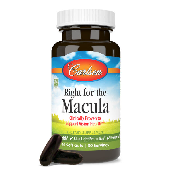 Right for® the Macula blends Lutemax 2020® and the beneficial omega-3 DHA. Lutemax 2020® provides lutein, zeaxanthin, and meso-zeaxanthin - three carotenoids that help protect our eyes, reduce eyestrain, and support glare tolerance from high-energy blue light and digital device use. They also protect against oxidative stress and promote macular health.