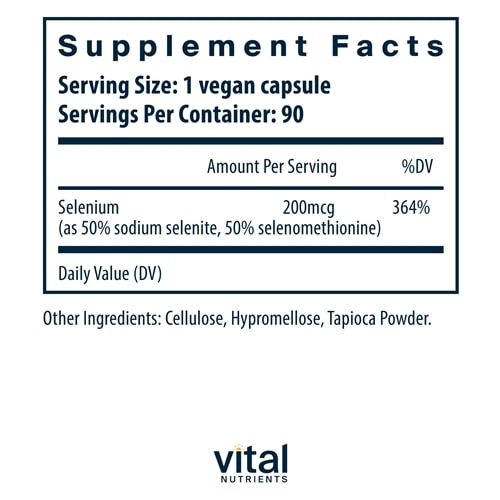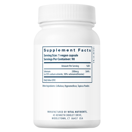 Selenium is a trace element and potent antioxidant that is essential to the body in small amounts.* Selenium helps cells to function normally by supporting the action of several enzymes, particularly antioxidant enzymes and those involved in thyroid hormone metabolism.* Selenium also supports the cardiovascular and immune systems and may help maintain prostate health.* Vital Nutrients Selenium 200mcg includes selenomethionine, a high-bioavailability, organic source of this essential trace mineral.*