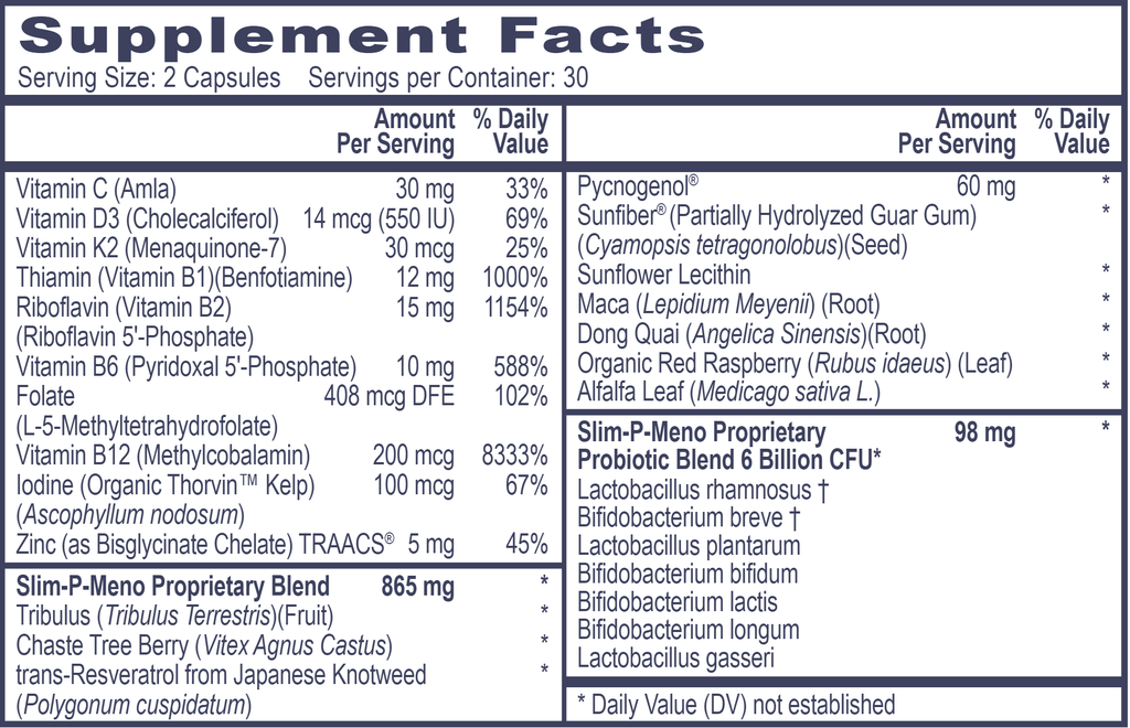 Slim-P-Meno is an exciting new formulation from PHP®, specially designed to meet the needs of women during perimenopause & menopause with support for healthy weight, cravings, energy, sexual health, bone support and mood-balance. Its proprietary blend of nutrients also helps to ease unpleasant symptoms a woman may experience during perimenopause/menopause