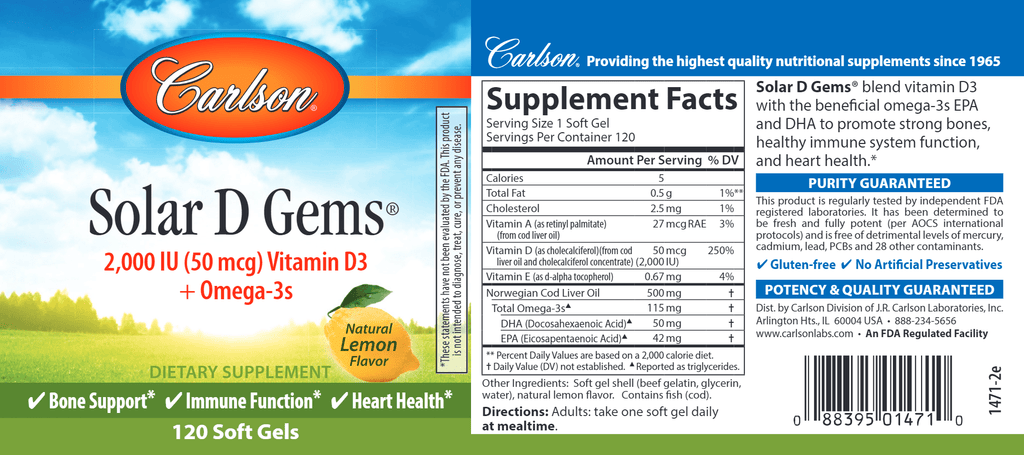 Solar D Gems® is a vitamin D3 supplement for those who don't get enough from food or the sun. Vitamin D is a superstar nutrient linked to many health benefits. What makes it so unique is that it's a vitamin you can get through food and also a hormone your body makes from the sun. Despite the multiple ways of getting vitamin D, many are still deficient due to changing seasons, sunscreen, skin color, age, and sun protection. Solar D Gems® also provides 115 mg of wild caught, sustainably sourced omega-3s, which support heart, brain, vision, and joint health.