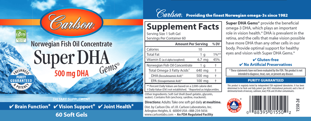 Before birth and during infancy, DHA plays an essential role in the healthy development of the entire nervous system, including the brain and retinas. DHA is provided to us in the womb and later from breast milk. As we develop and mature, we get DHA from our diet or a supplement, and it continues to play a critical role in brain and vision health. DHA is prevalent in the retina, and the cells that make vision possible have more DHA than any other cells in our body. Provide optimal support for cognitive function and vision with Carlson Super DHA Gems®. Like all Carlson omega-3s, freshness, potency, and purity are guaranteed.