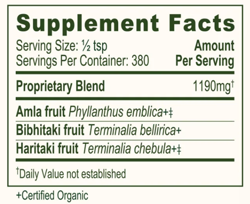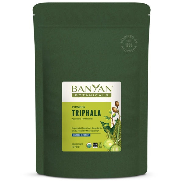 Triphala is one of the most beloved digestive aids in all of Ayurveda. In fact, it is recommended and used more than any other Ayurvedic herbal formulation. Popular for its unique ability to encourage a natural, gentle bowel cleanse, triphala detoxifies the system while simultaneously replenishing and nourishing it. This traditional formula supports the proper functions of the digestive, circulatory, respiratory, and genitourinary systems. Translated as "three fruits," it is composed of the dried fruits of amalaki, bibhitaki, and haritaki. Containing five of the six tastes (all but salty), triphala readily removes excess vata, pitta, and kapha from the body, bringing balance and proper functioning to the system. It is commonly taken in the evening before bed, first thing in the morning, or at both times as a daily supplement to help maintain balance of the doshas.*