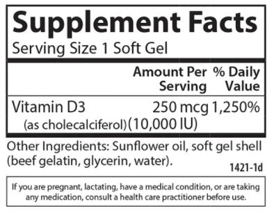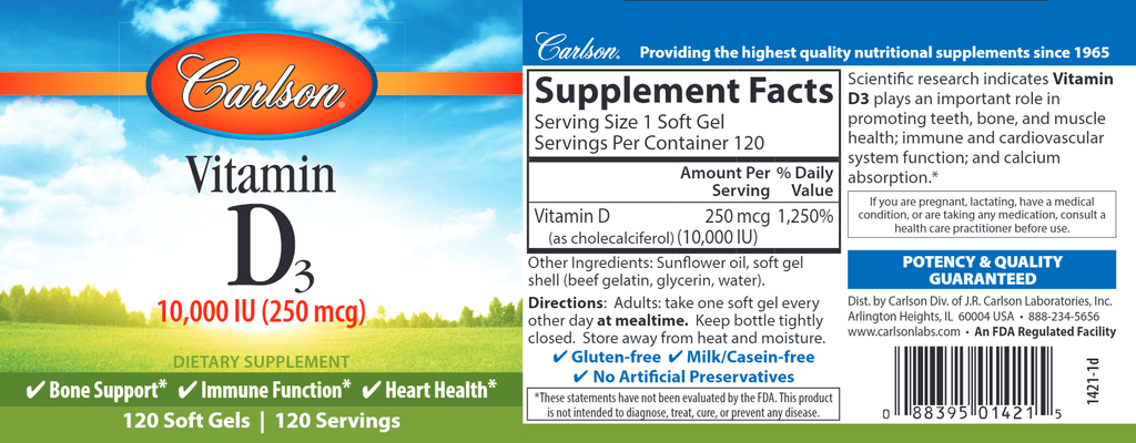 Carlson Vitamin D3 10,000 IU (250 mcg) is the preferred form of vitamin D that's important for promoting strong bones and supporting immune system and heart health. Higher levels of vitamin D3 in the blood are associated with strong bones and good health, as well as a strong immune system. Each soft gel provides 10,000 IU (250 mcg) of vitamin D3.