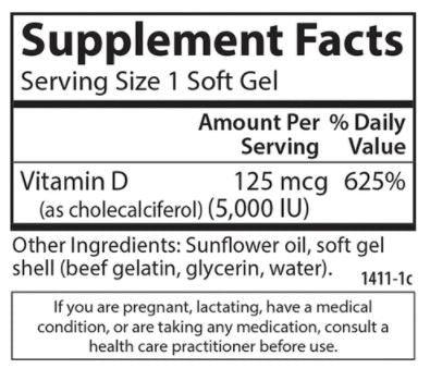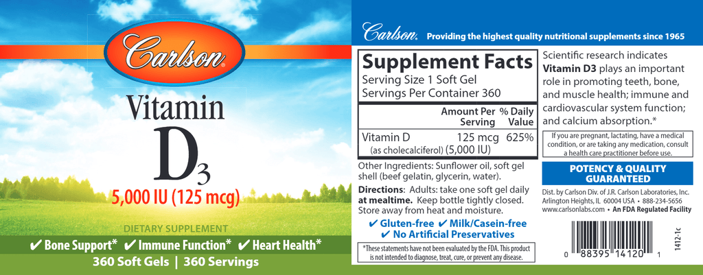 Carlson Vitamin D3 5,000 IU (125 mcg) is the preferred form of vitamin D that's important for promoting strong bones, supporting immune system health, and helping to regulate calcium and phosphorus metabolism. Higher levels of vitamin D3 in the blood are associated with strong bones and good health, as well as a strong immune system. Each soft gel provides 5,000 IU (125 mcg) of vitamin D3.
