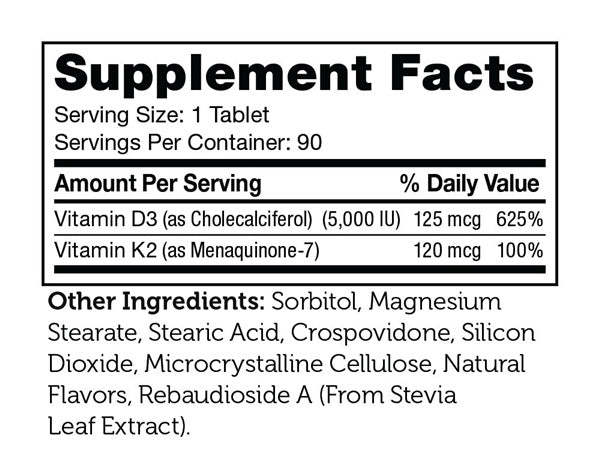 Zahler Vitamin D3 & K2 provides a robust dose of both Vitamin D3 and Vitamin K2. Vitamin D3 is a crucial nutrient for overall health, specifically maintaining strong muscles, bones, teeth and a healthy immune system. However, millions of individuals are deficient in this life-sustaining vitamin. In addition to supporting bone health‚ research shows that D3 deficiency is linked to a host of conditions that present serious health risks. Also included is Vitamin K2, which supoorts bone density and aids with calcium absorption. Zahler's Vitamin D3 & K2 provides all the benefits of vitamin D3 and K2 in a delicious chewable tablet.