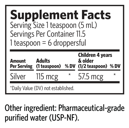Argentyn 23® Bio-Active Silver Hydrosol™ is composed of only 99.999% pure silver and purified water. The unique combination of >98% positively charged silver ions and nanoclusters of an unprecedented size as small as 0.8 nm, allows for easy absorption and excretion. The low concentration of 23 ppm offers your patients the most effective and safest dietary silver supplement available.*